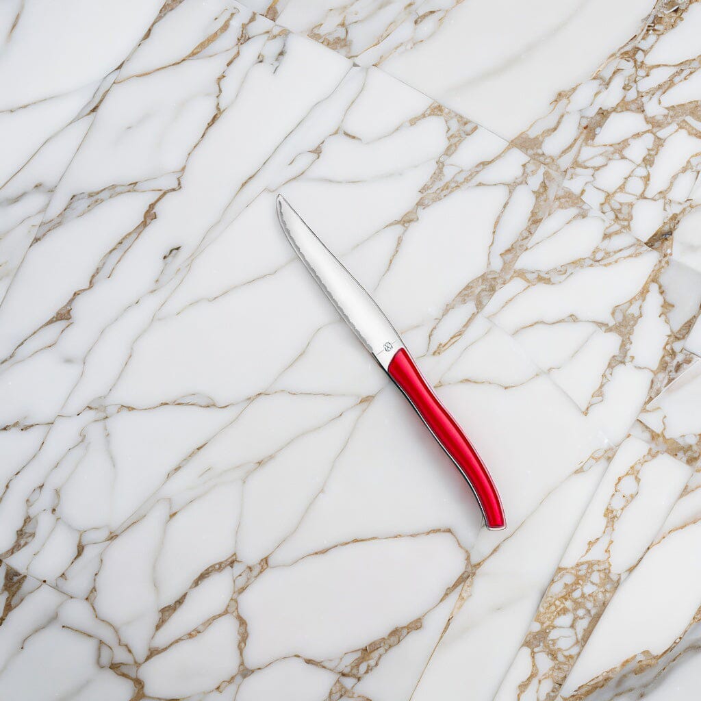 Ces couteaux à steak avec une superbe finition en simili cuir rouge sur les manches apportent une combinaison parfaite de classique et de moderne à la table. La forme traditionnelle donne un look unique et les dentelures appliquées avec précision permettent de couper tous les plats sans effort. Grâce au design caractéristique de Laguiole français de ces couteaux, avec le souci du moindre détail, vous créez une ambiance à table et savourez un délicieux repas avec style.