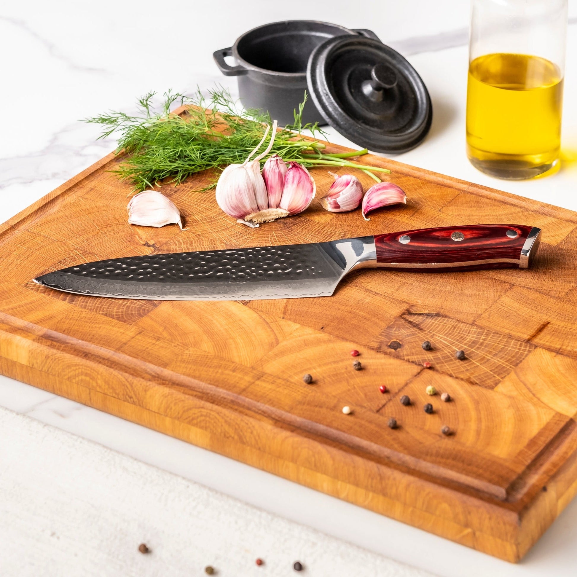 Le couteau de chef Mahogany Red Series de Shinrai Japan est unique pour chaque cuisine. Ce couteau de chef populaire est indispensable dans votre bloc à couteaux. Aucune tâche de découpe n'est impossible pour ce polyvalent. De la viande, du poisson et des légumes au hachage fin des herbes.
