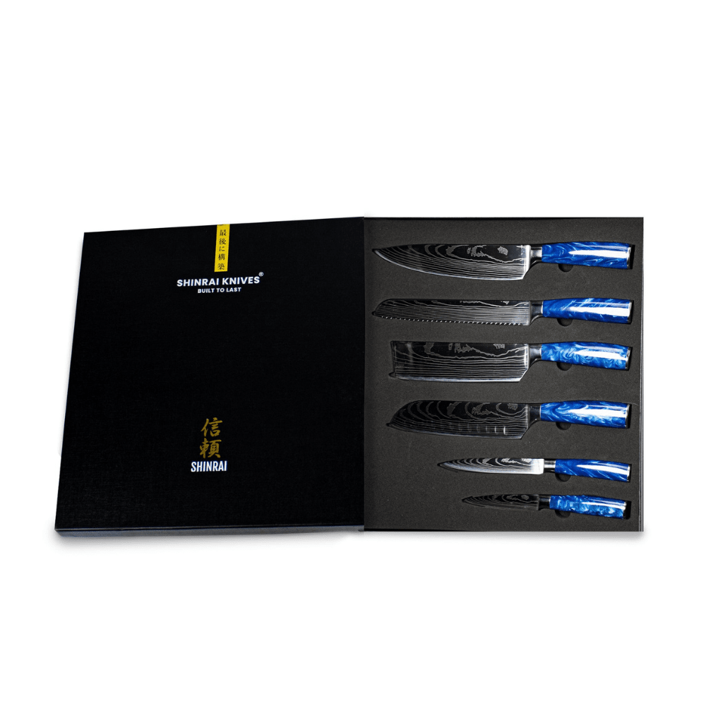 La solidité allemande sous une forme japonaise. Magnifique et unique ensemble de couteaux Shinrai Japan. Tous les couteaux dont vous avez besoin dans un seul set ! L'ensemble de couteaux Damascus Print Series se compose d'un couteau de chef (20 cm), d'un couteau Santoku (18 cm), d'un couteau Nakiri (18 cm), d'un couteau à pain (20 cm), d'un couteau d'office (13 cm) et d'un Couteau d'office (9 cm).