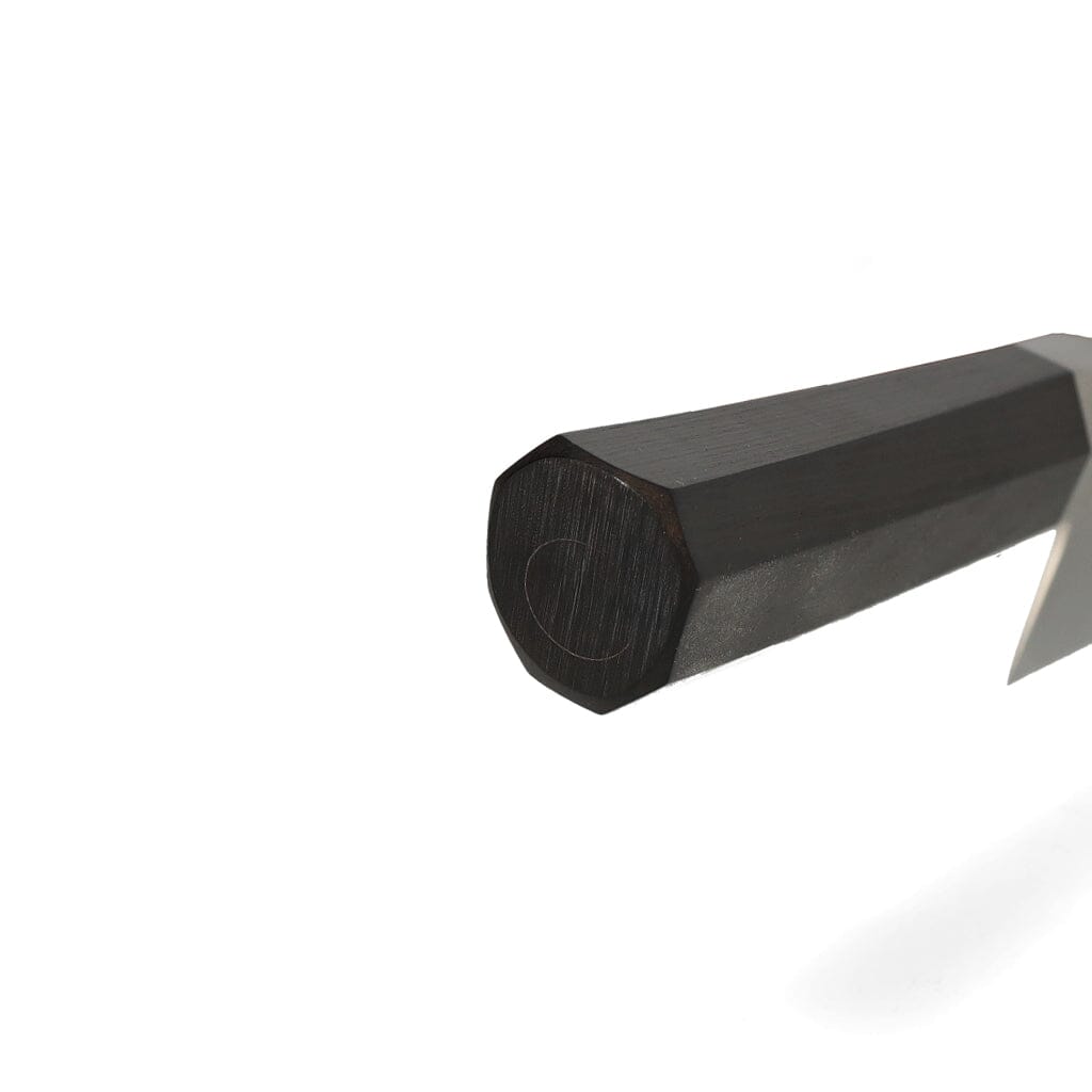 Le manche en bois de pakka grainé noir allie fonctionnalité et style. La forme ergonomique octogonale offre un contrôle et un confort optimaux, même lors d'une utilisation prolongée. La transition harmonieuse du manche à la mitre témoigne de la finition de haute qualité, faisant de ce couteau non seulement un ustensile, mais aussi une œuvre d'art.