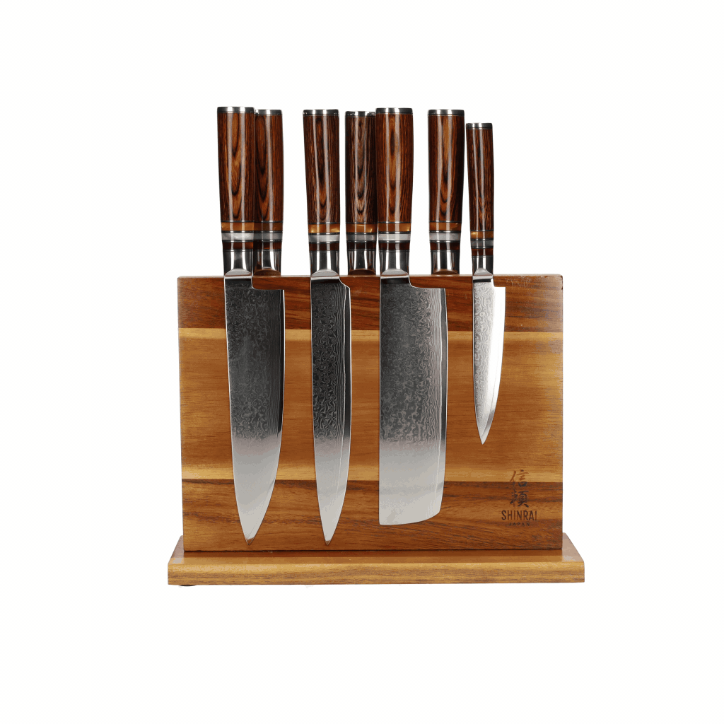 Ce bloc à couteaux en bois d'acacia est livré avec 7 couteaux de la série Micarta Jewels qui conviennent à diverses tâches de coupe en cuisine. La combinaison de manches en bois de pakka avec des anneaux en micarta ornés de bijoux et d'un bloc à couteaux en bois d'acacia fera vraiment ressortir les couteaux.