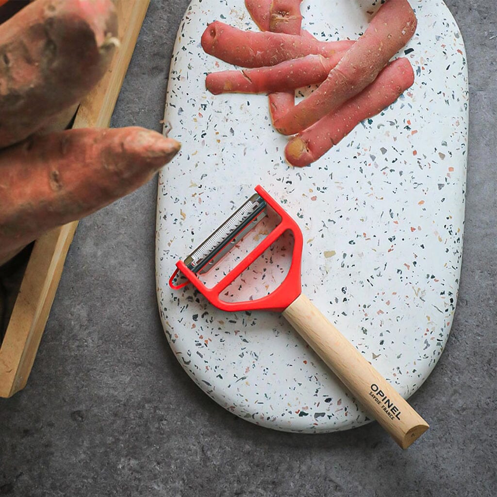 Découvrez le T-Duo Peeler Red de la marque française Opinel , équipé d'une double fonction peeling.